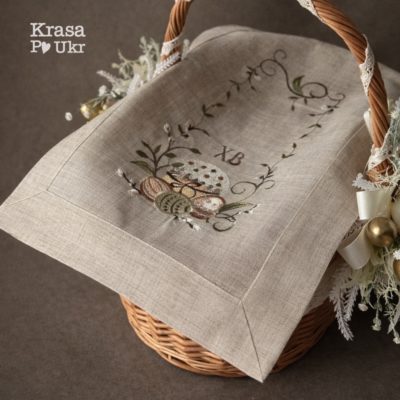 #510 Скатертина вишита великодня “Оливкові мазки” – 110*160 см, 135*180 см, 150*220 см – білий льон