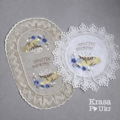 Комплект атласних серветок “корзинка з пудровими писанками” (44*30 см і 30 см)