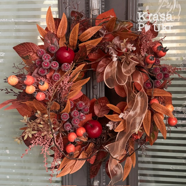 Дизайнерський осінній вінок поєднує відтінки теракоти, помаранчевого та червоного, натхненно зібраний зі штучних елементів. Він стане яскравою прикрасою дверей, створить атмосферу тепла у домі та стане стильним подарунком для друзів і близьких. Кожна деталь вінка продумана, щоб підкреслити красу осені та надати інтер’єру неповторного шарму.