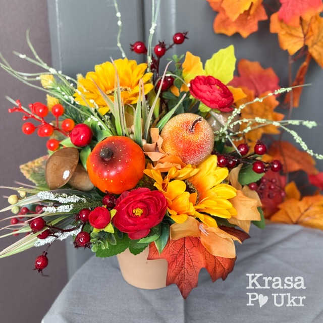 Композиція в кашпо, дизайн “осінній градієнт” з соняшниками