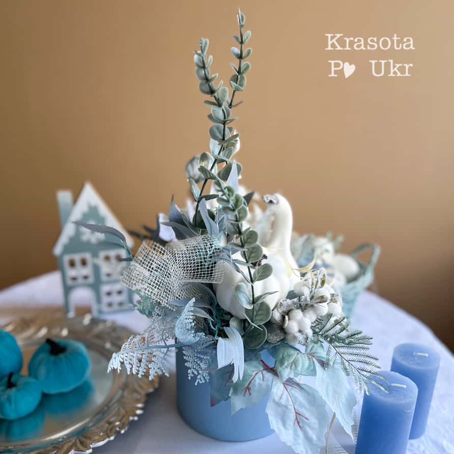 Композиція 38 см у кашпо, дизайн “екстравагантна осінь – блакить”