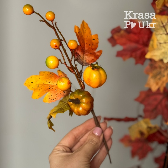 Привнесіть в осінній декор затишок та легкість творчості! Ця декоративна гілка з гарбузами та яскравим листям стане чудовим акцентом у ваших виробах, підкреслюючи красу сезону. Використовуйте її для легкого створення композицій, вінків або як самостійну прикрасу у вазу. Натуральні кольори та деталі роблять її живою та красивою.