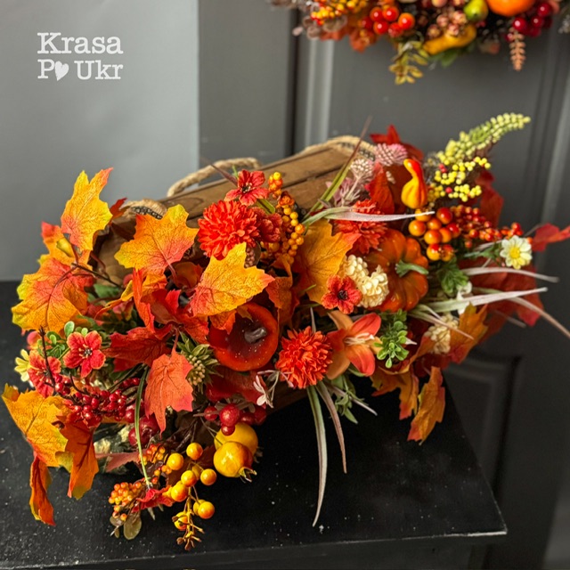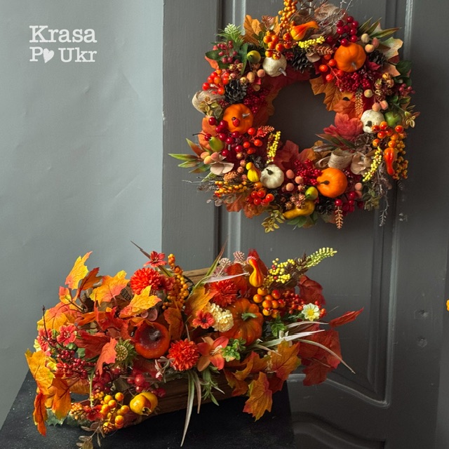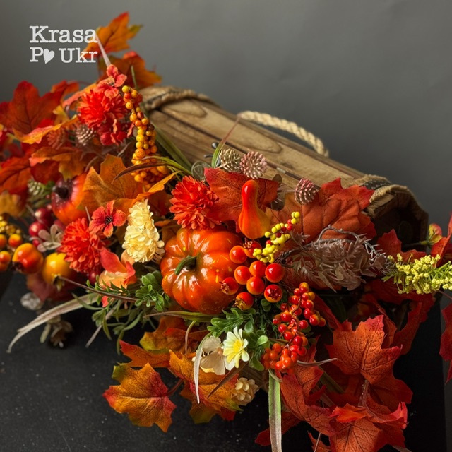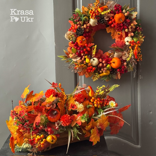 Комплект виробів ручної роботи «Класична осінь» — це гармонійне поєднання теплих жовтих, помаранчевих і червоних відтінків, що передають чарівність золотої пори. Вишуканий вінок доповнено композицією у дерев’яній скриньці — справжня родзинка цього набору. Такий декор створює атмосферу затишку й тепла, ідеально пасує до осіннього інтер’єру чи вхідних дверей будь-якого розміру.