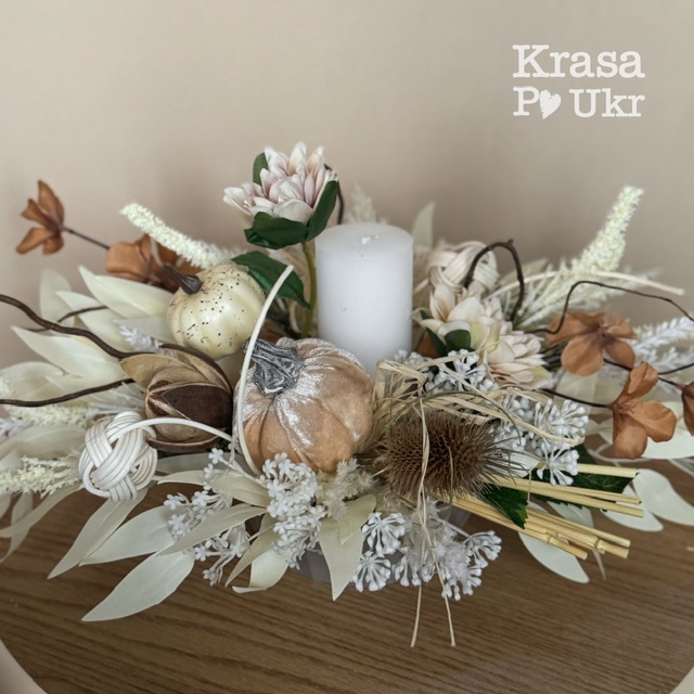 Ніжна осіння композиція зі свічкою створена у пастельній гамі — поєднання молочних, бежевих і карамельних відтінків надає їй особливої теплоти. Декор доповнений велюровими гарбузиками, штучними гілочками, зеленню та квітами, які створюють затишну атмосферу осені. Композиція стане чудовою прикрасою для дому, кав’ярні чи офісу, а також ідеальним подарунком для близьких. Виготовлена вручну з турботою про деталі — кожен елемент продуманий для гармонійного поєднання кольорів та фактур.