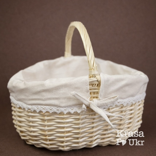 Внутрішня частина оздоблена текстильним чохлом світлого молочного кольору (слонова кістка). Чохол фіксується зав’язками з акуратним бантиком, а нижній край прикрашений ніжним мереживом. Таке поєднання додає кошику святкової легкості та робить його зручним у використанні.