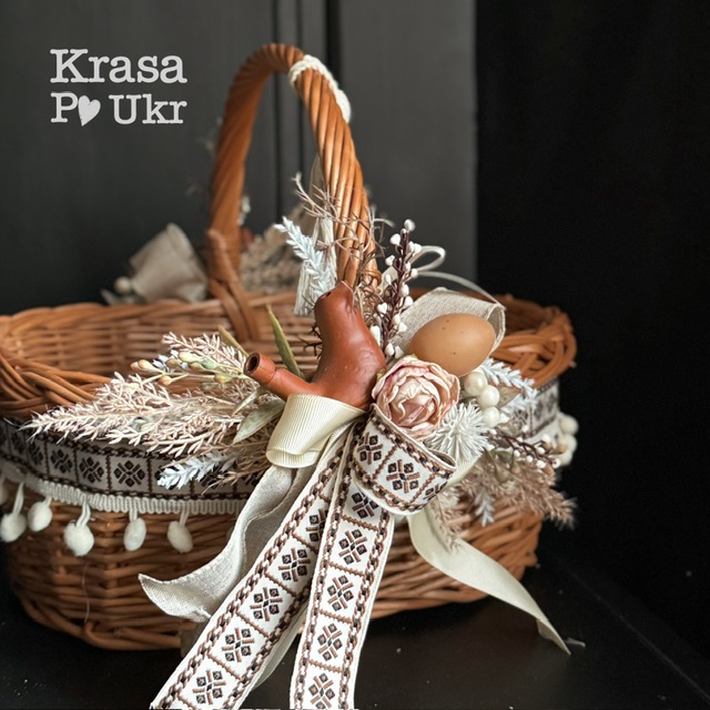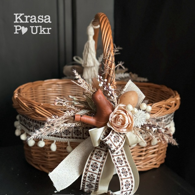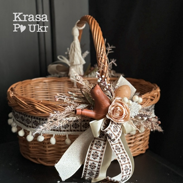Такий кошик стане ідеальним вибором для освячення у Великдень. Він поєднує натуральні матеріали, ручну роботу та елементи української символіки, тож чудово підійде і як подарунок близьким.