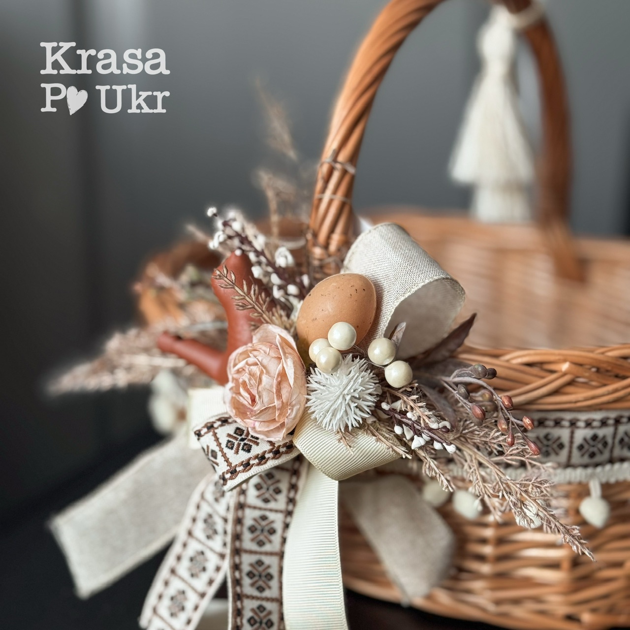 Декор виконано у пастельних відтінках, що надають кошику ніжності та сучасного вигляду. Центральним акцентом композиції є мила керамічна пташка — “сопілочка”, яка символізує пробудження весни, життя та добро. Її доповнюють декоративна трояндочка, схожа на сухоцвіт, легка зелень і дрібні пастельні деталі, що створюють атмосферу спокою й тепла.