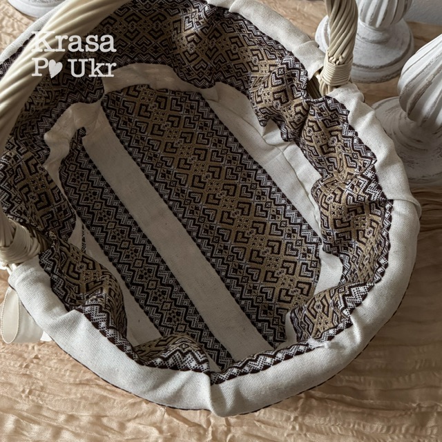 Кошик із натуральної лози з чохлом із вишитої тканини у теплих коричнево-молочних відтінках — це поєднання естетики, етн та стилю. Такий кошик стане чудовим доповненням до Великодня чи Спаса.