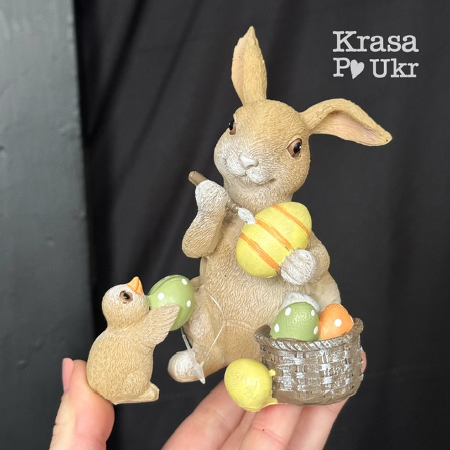 Керамічна фігурка зайчика — ніжний декоративний елемент для весняного та великоднього оформлення та декору. Композиція із зайчиком та декоративними яйцями символізує оновлення, тепло й святковий настрій.