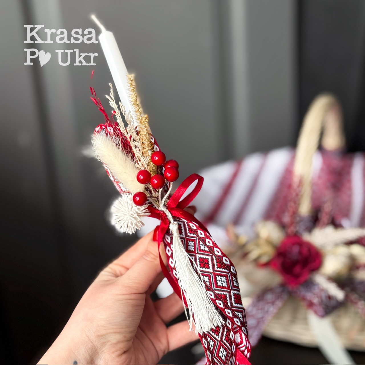 - До комплекту входить кошик з дизайну в стилі мінімалізм, свічка та вишитий рушник 50*34 см від нашої майстерні Krasa Po Ukr
