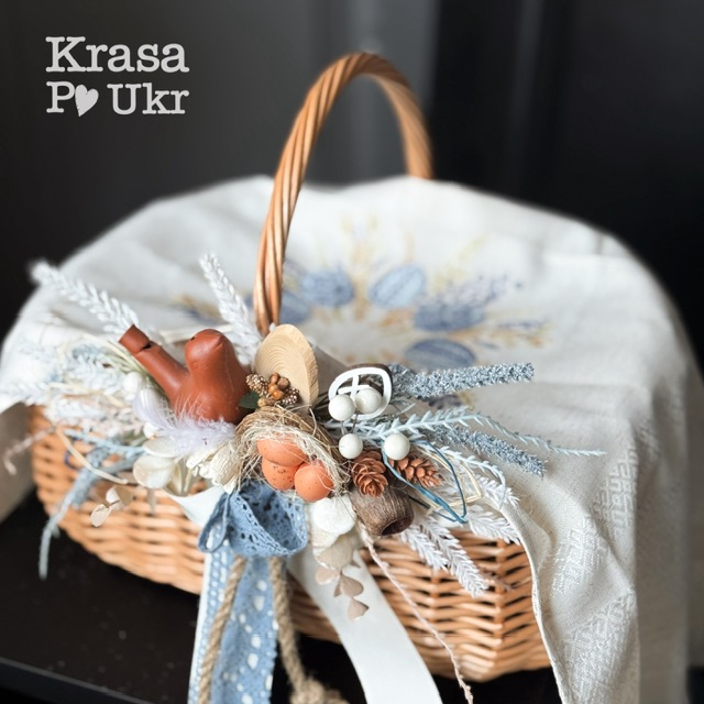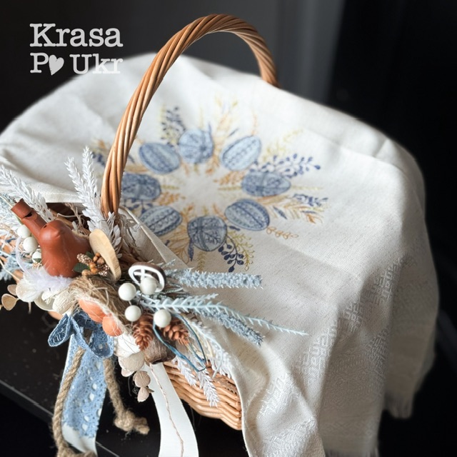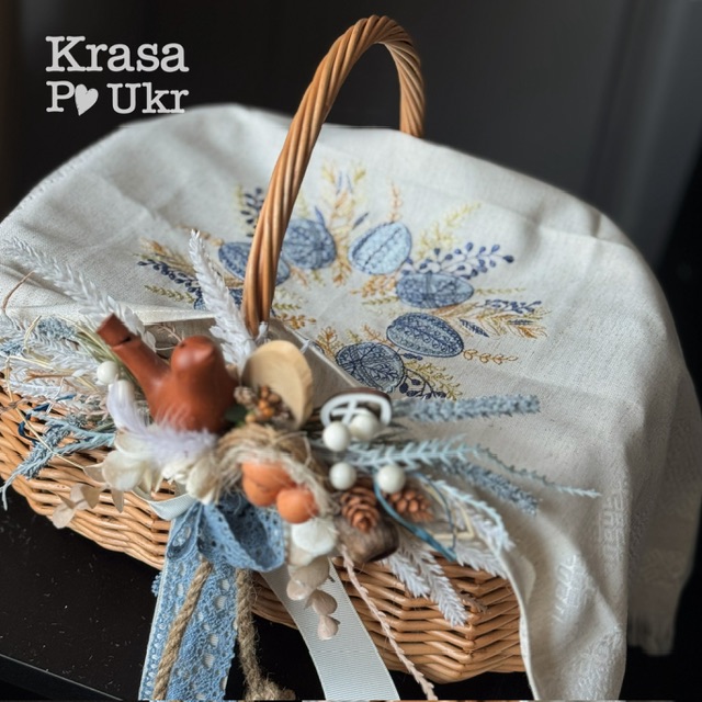 Комплект – великодній кошик 35 см, дизайн «весняний спів» та рушник “патріотичні писанки”
