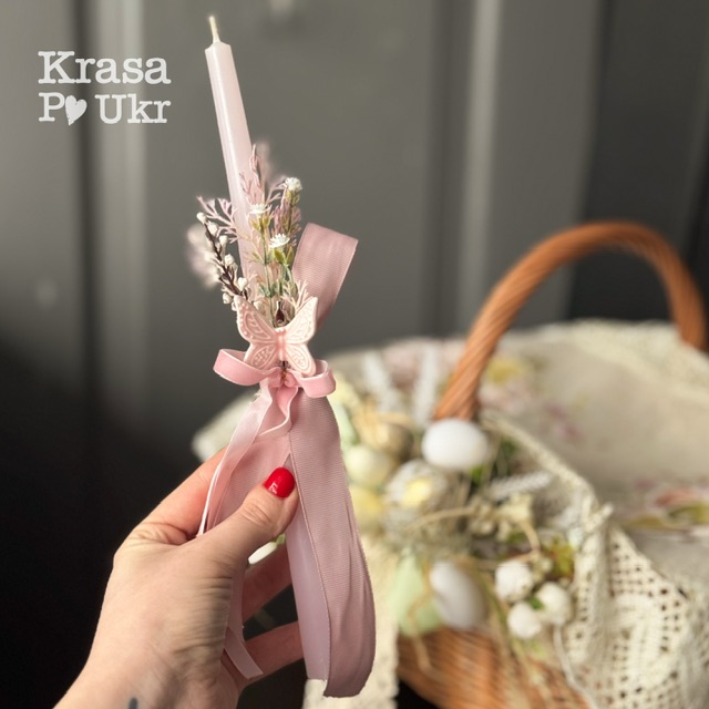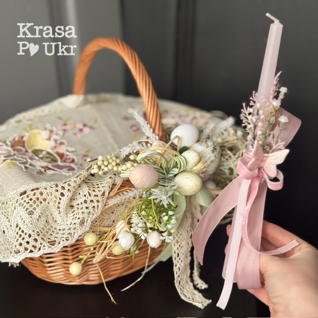 - До набору входить кошик з дизайном, серветка та свічка з декором — комплектація на вибір.