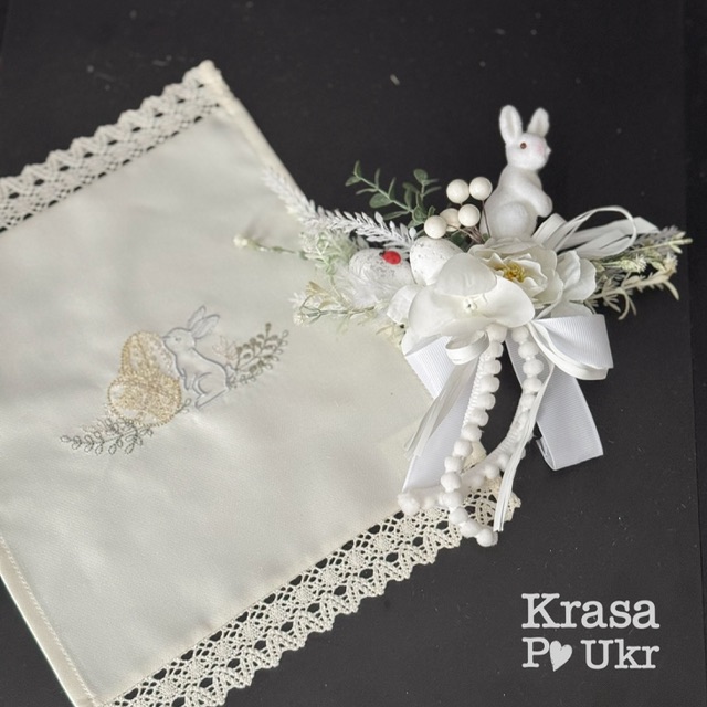 Комплект для дитини – прикраси на кошик та рушника “патріотичне зайчення” та дизайн “білий кролик”
