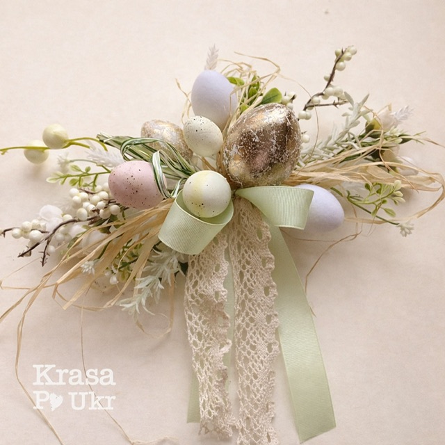 Ніжна пасхальна прикраса на кошик у дизайні «Весняна ніжність». Виконана у пастельних відтінках із декоративними яйцями, зеленню та текстильними стрічками. Легко кріпиться до кошика, підходить для дитячих і дорослих пасхальних кошиків. Ручна робота Krasa Po Ukr.