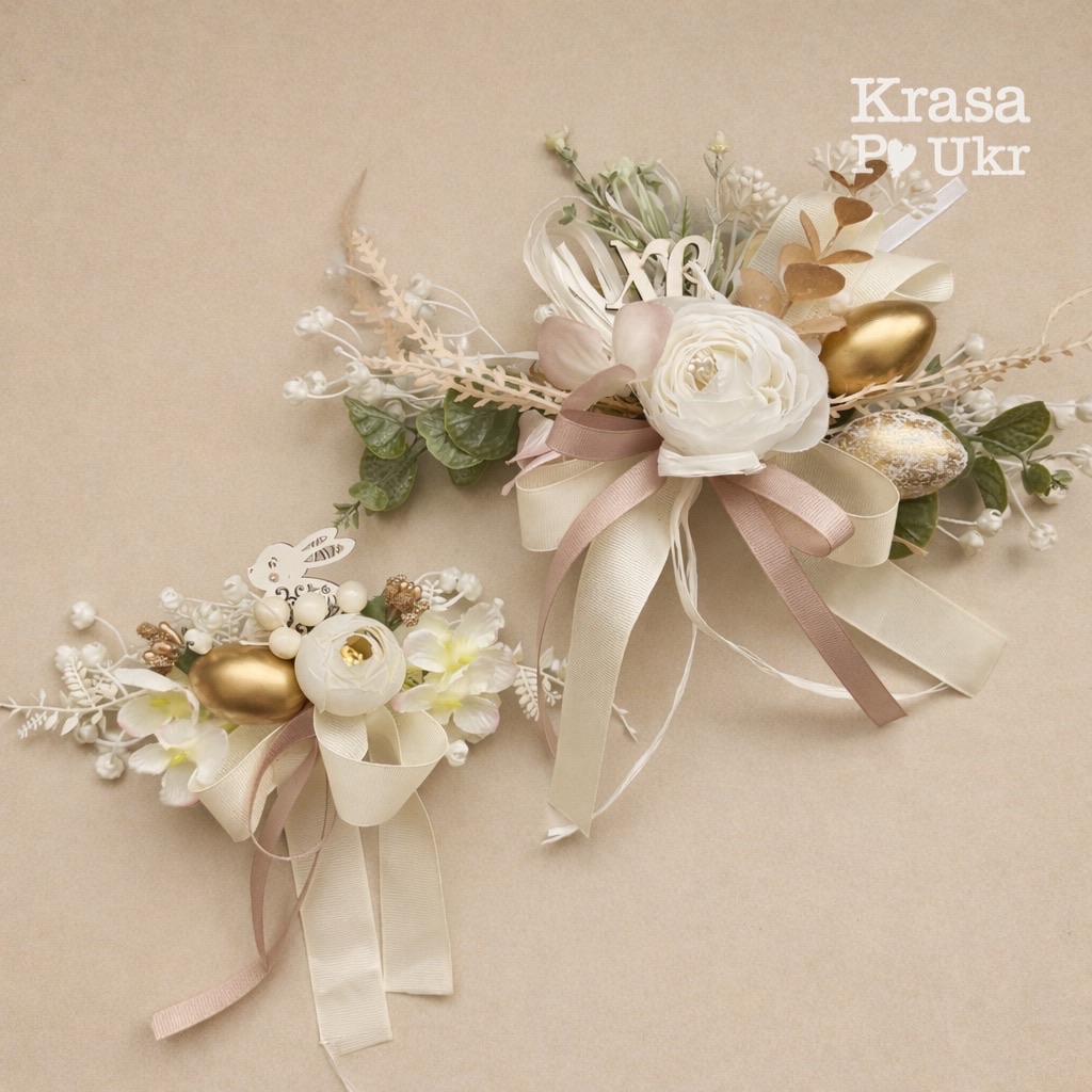 Ніжна дитяча прикраса у молочно-пудрових тонах із золотим акцентом та зайчиком. Легка, акуратна й святкова — ідеально доповнить великодній кошик маленької принцеси чи хлопчика.