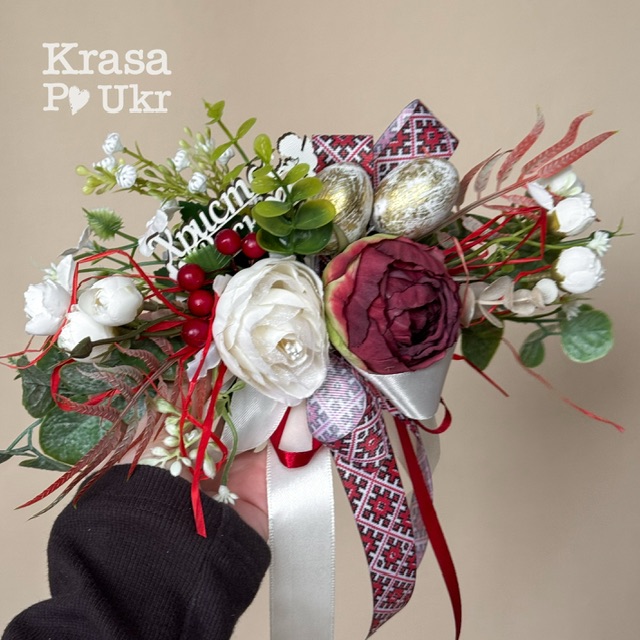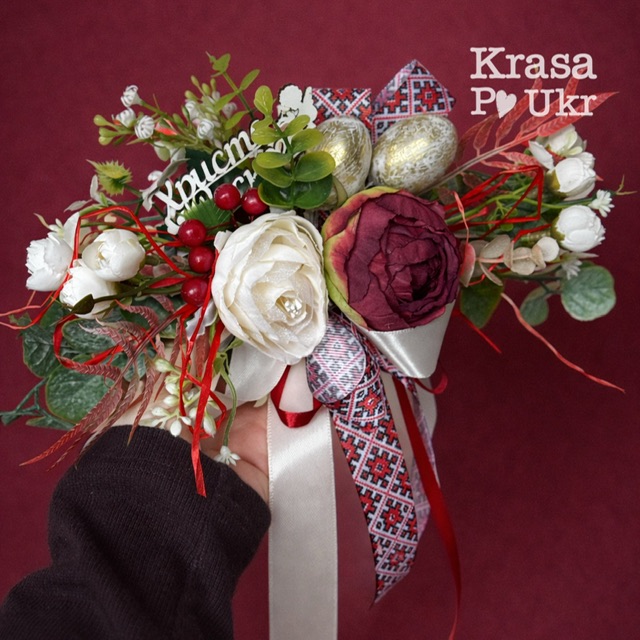 Прикраса великодня для корзини, дизайн “вишиванка” у бордово-молочному поєднанні