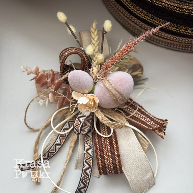 Поєднання традиційного орнаменту, натуральних відтінків та модерної композиції створює стриманий, естетичний образ. Декор доповнений декоративними писанками, сухоцвітами, текстильними стрічками, штучними елементами та етно-акцентами.