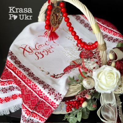 Елегантна прикраса на великодній кошик у насичених червоно-бордових відтінках з етно мотивами. Декор поєднує традиційні українські елементи та сучасну святкову композицію.