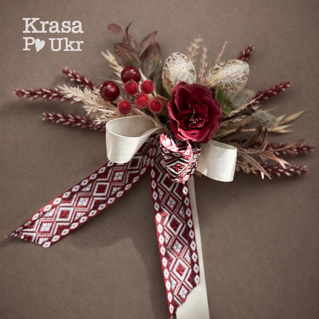У композиції використано етно крайку з орнаментом, декоративні писанки, квіткові елементи, ягоди та сухоцвіти, що створюють атмосферу затишку і великоднього свята. Бордові акценти гармонійно доповнюють натуральні текстури та додають декору виразності.