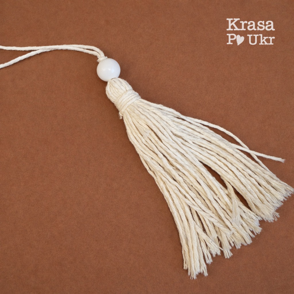 Китиця декоративна 12 см з мішковини з деревʼяними бусами – молочна