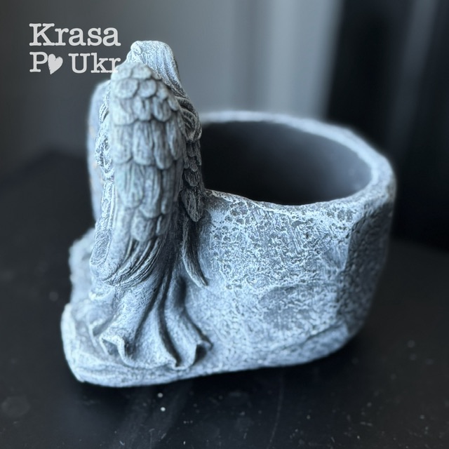 Кашпо виконане з міцного бетону, що забезпечує довговічність та стійкість до погодних умов. Рельєфна фігура ангела символізує пам’ять, любов та духовний захист, створюючи атмосферу спокою та світлої пам’яті.
