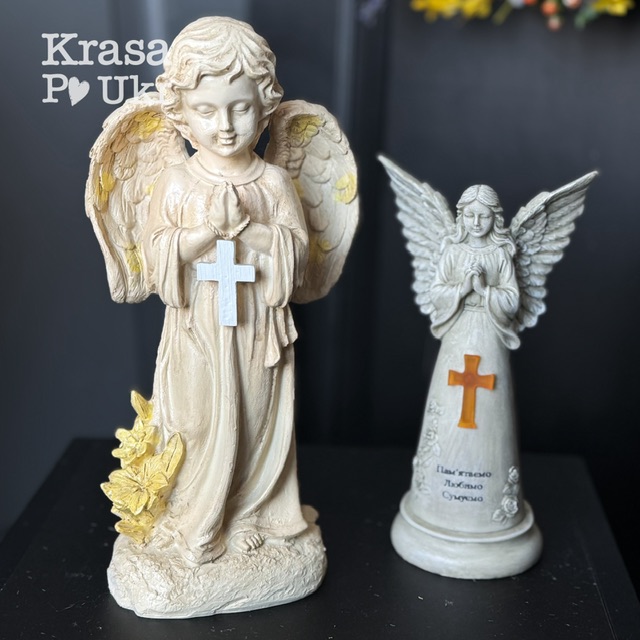 Декоративна ритуальна фігурка ангела з хрестом, що символізує віру, спокій та світлу пам’ять про близьку людину.