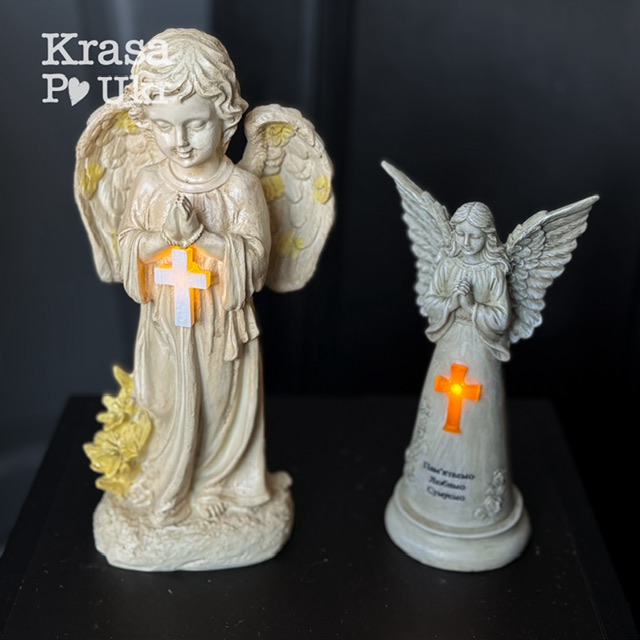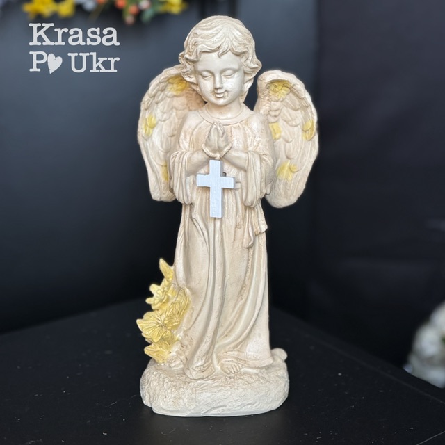 Ніжний образ ангела з молитвою та хрестом у руках створює атмосферу спокою, духовного захисту та пам’яті. Така фігурка стане красивим елементом оформлення могили або пам’ятної композиції.