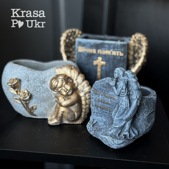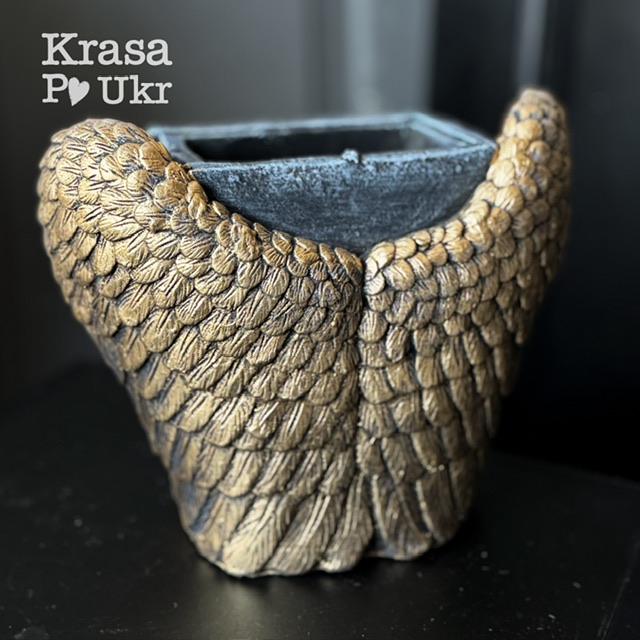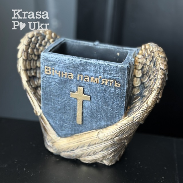 Ритуальне декоративне кашпо з символічним дизайном крила ангела та хреста, що уособлює пам’ять, захист і світлу шану до близької людини.