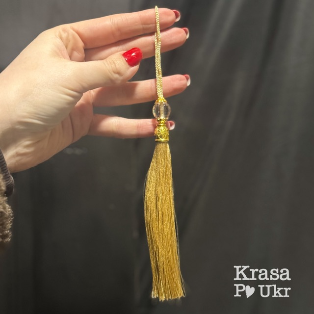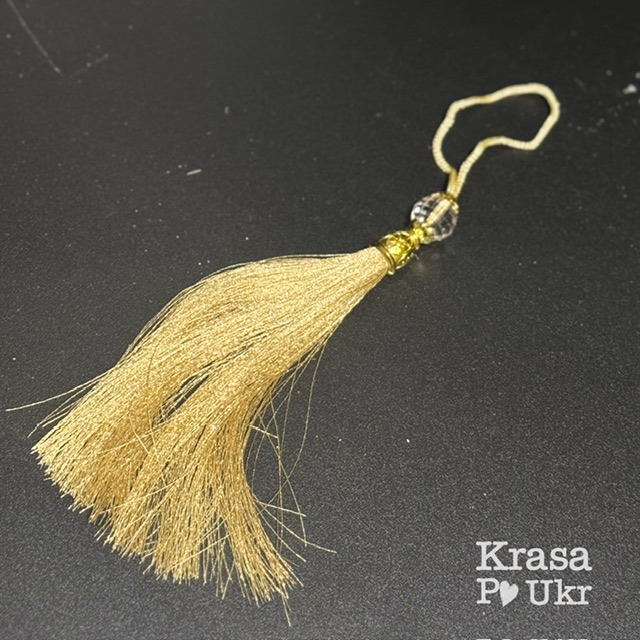 Китиця виготовлена з тонких декоративних ниток, які красиво лягають і створюють живу, рухливу форму. Нитки акуратно зібрані та зафіксовані у верхній частині, що забезпечує охайний вигляд і довговічність у використанні. Зручна петелька дозволяє легко кріпити китицю до різних елементів декору без додаткових інструментів.