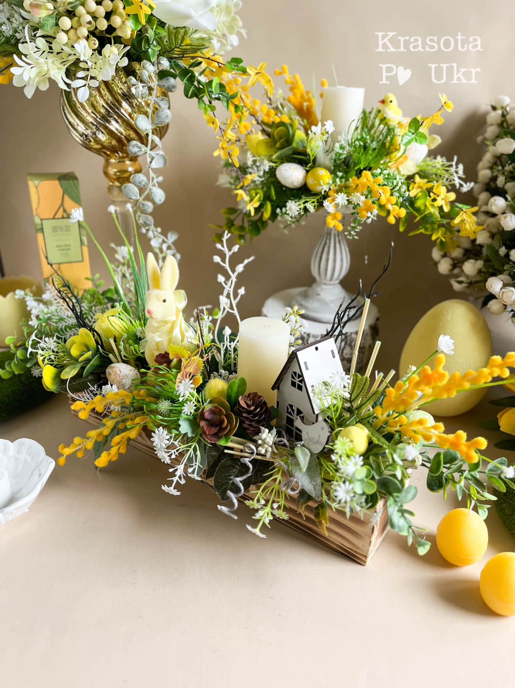 Композиція 50 см зі свічкою, зайчиком та будиночком, “Сонячна весна” 💚