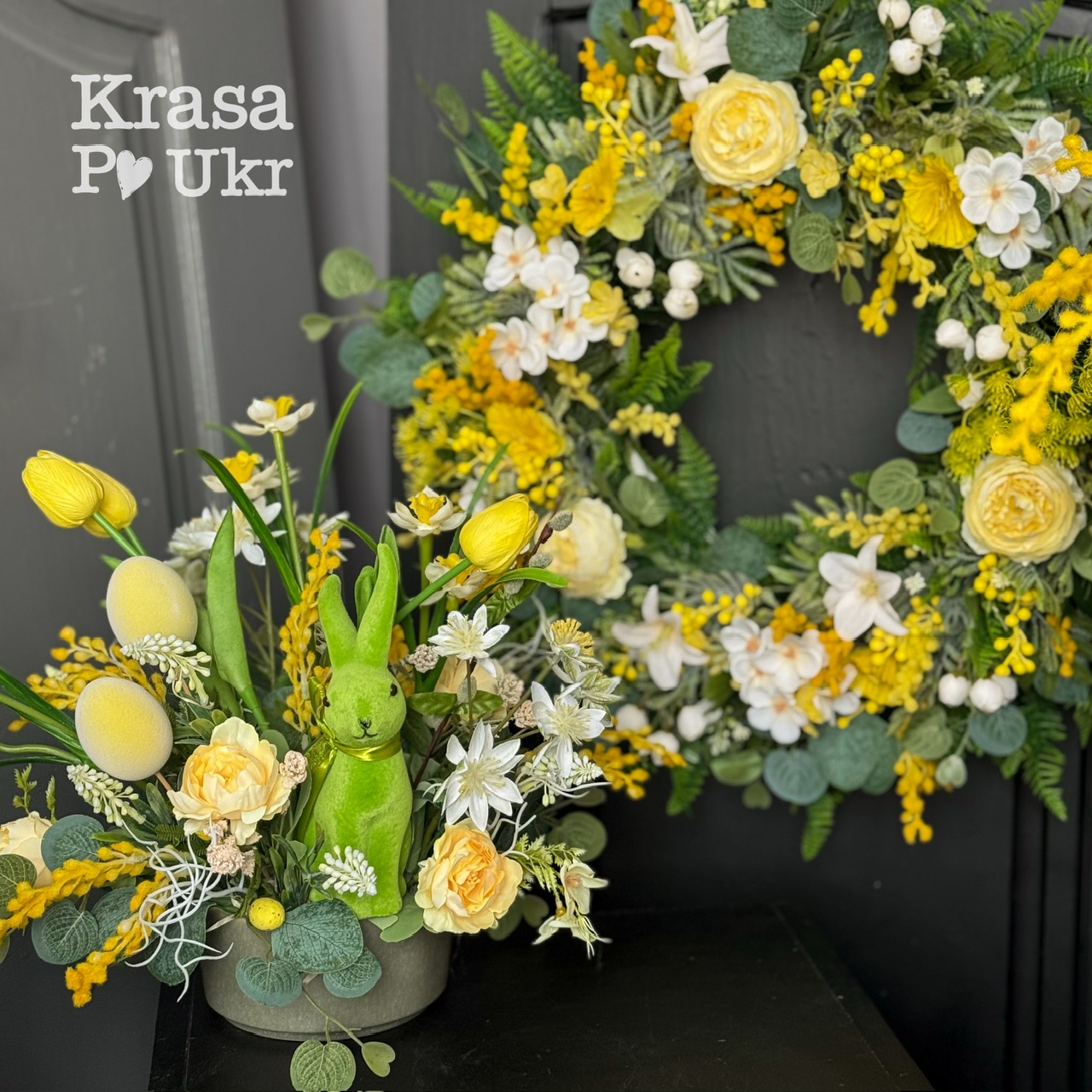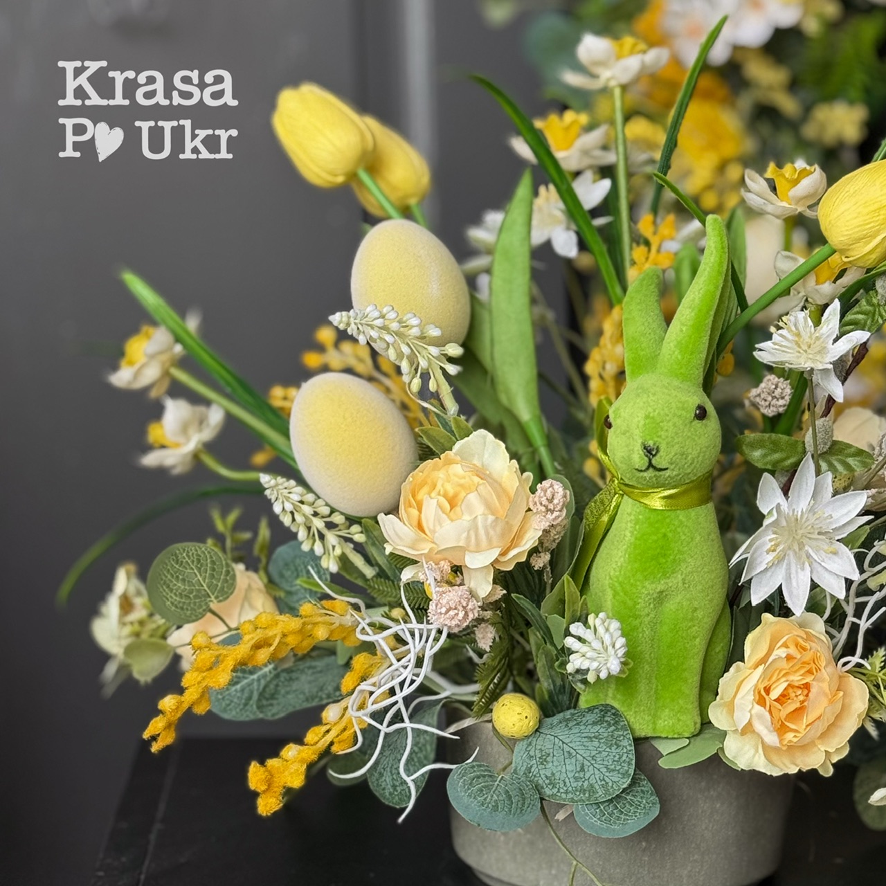 Великодня композиція “Це моя весна” з мімозою і тюльпанами та зайчиком