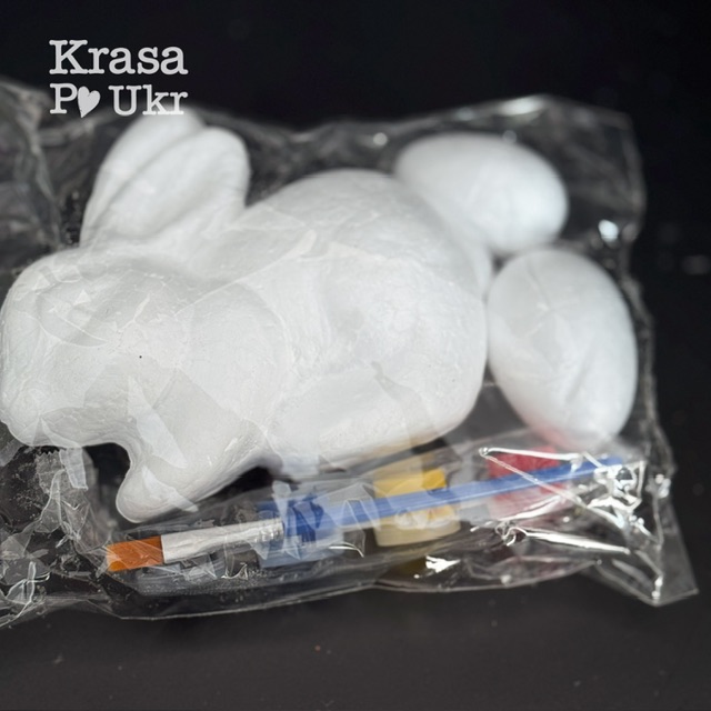 Набір для великодньої творчості з пінопластовими заготовками. У комплекті пінопластова фігурка зайчика, пінопластові яйця та фарби з пензликом. Заготовки мають гладку поверхню та підходять для розпису й створення великоднього декору власноруч.