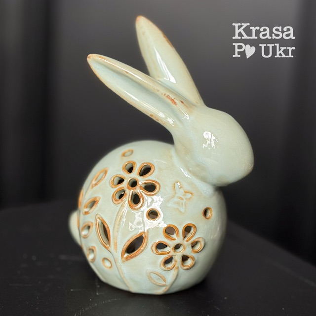 #6131 Керамічна фігурка 15 cм з лед світлом в середині ЗАЙЧИК з квітковим візерунком