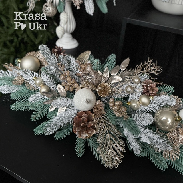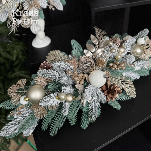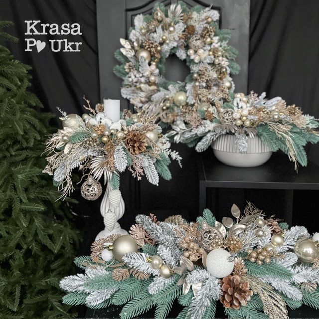 - декор в кольорі шампань з безліччю дрібних новорічних деталей