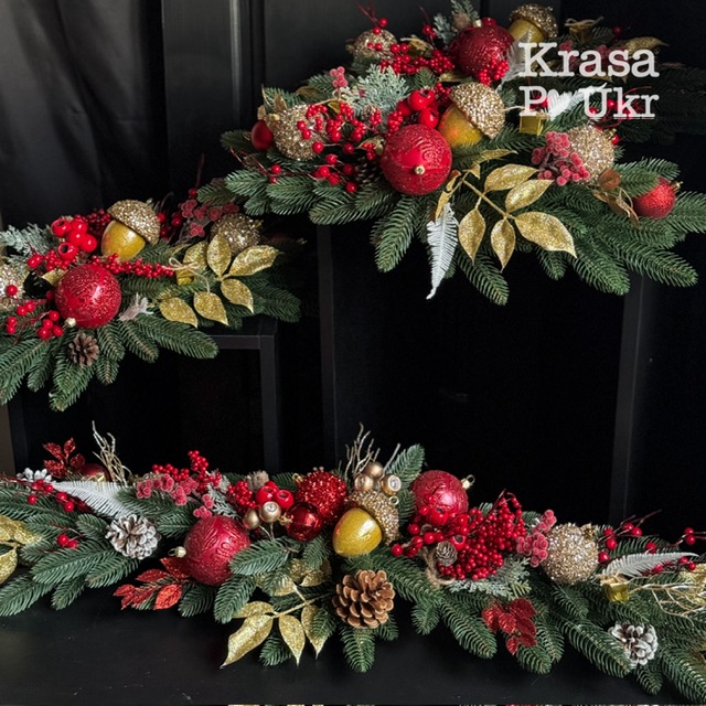 Ця композиція стане не просто прикрасою, а центром святкового декору, який наповнить простір теплом і святковим блиском. Вона створена, щоб щороку дарувати вам радість, красу та відчуття свята. Перегляньте також інші варіанти гірлянд, вінків і ялинок із литої хвої на нашому сайті — разом вони створять ідеальний комплект для вашого новорічного інтер’єру.