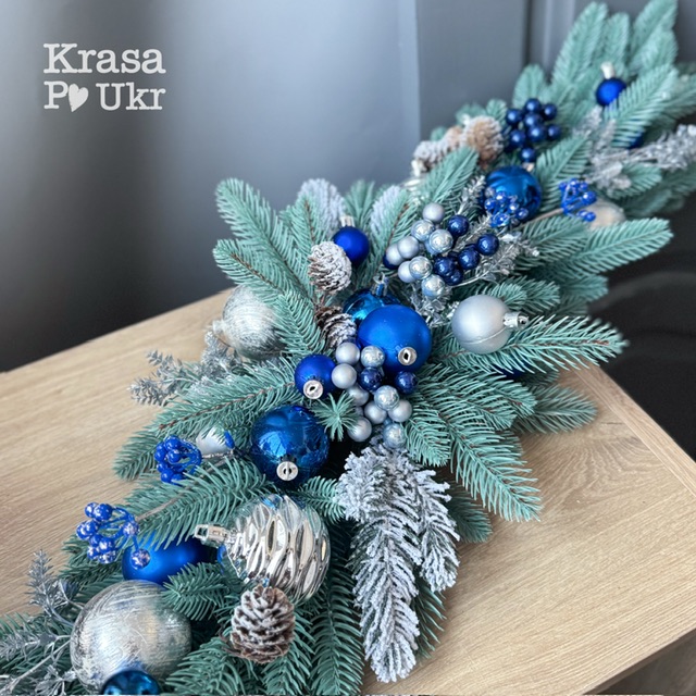 Ялинкова гірлянда з литої хвої у холодній срібно-синій гамі — вибір для тих, хто цінує сучасну новорічну естетику. Поєднання реалістичної литої хвої з благородними срібними, білими та насичено-синіми акцентами створює глибокий, “електричний” ефект.