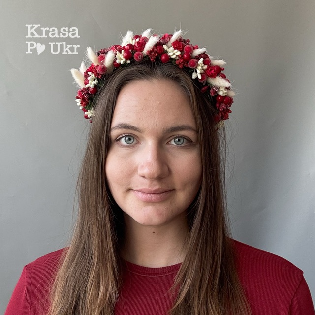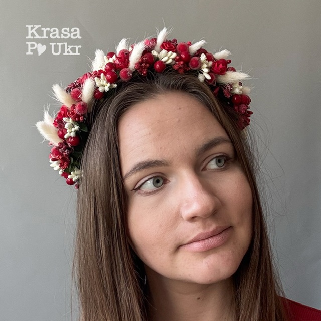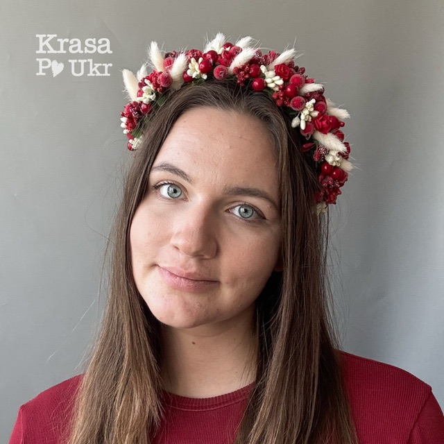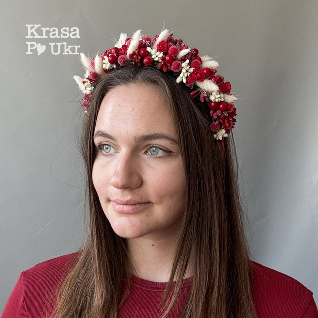 Вінок на голову у червоному градієнті з лагуручом, дизайн “українська вишиванка”