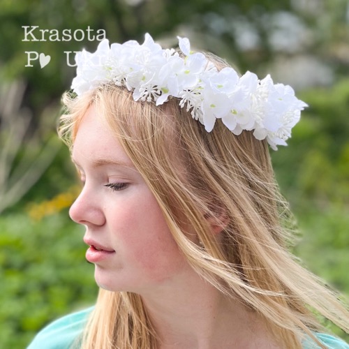 - Вінок сплетено з квіток гортензії, добавки і білої зелені