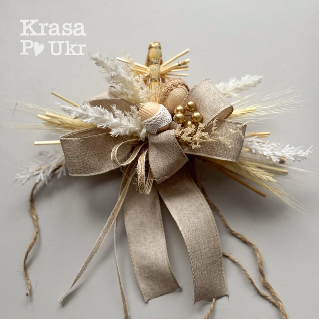 Декорація на великодній кошик у натуральній бежево-молочній гамі. Композиція з текстильного банта, декоративних елементів, сухоцвітів, штучних елементів та соломʼяним ангелом ручної роботи.