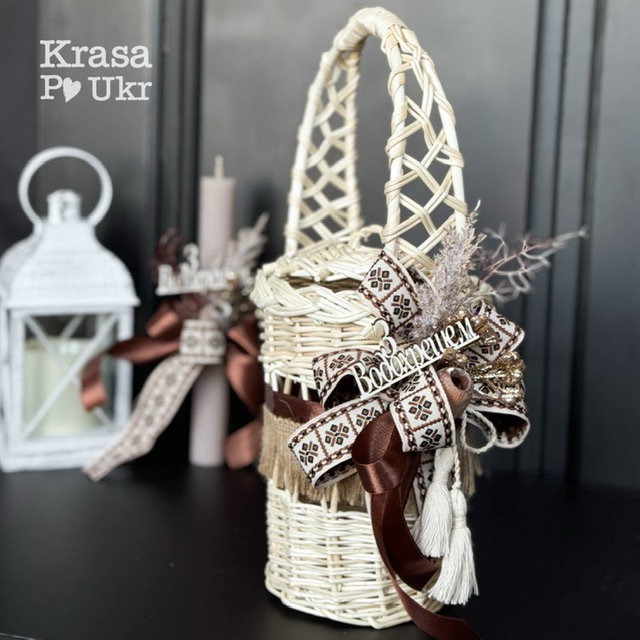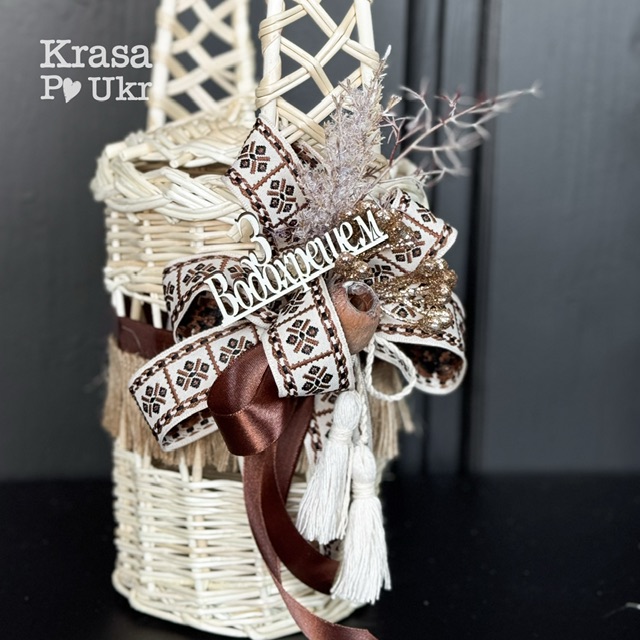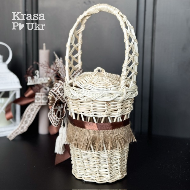 Кошик на банку для Водохреща з колекції «Сучасні традиції» — стильний та практичний декор для освячення води. Кошик сплетений вручну з натуральної лози та має світлий молочно відтінок, який гармонійно поєднується з шоколадними акцентами в декорі. Розрахований на стандартну 1-літрову банку з освяченою водою.