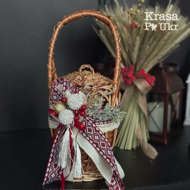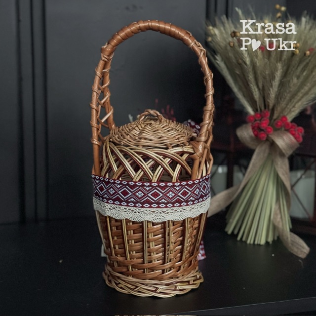Корзина на Водохреща “вишитий мінімалізм” — авторський виріб від майстерні декору Krasa Po Ukr, створений для освячення води на Йордан. Корзинка сплетена вручну з натуральної коричневої лози та розрахована під стандартну 1-літрову баночку (банка не входить у комплект). Декор виконано у традиційному українському стилі: вишивана стрічка з орнаментом, червоні декоративні ягоди, сухоцвіти, кутасики та інші елементи. Кошик має зручну ручку та декоративну кришечку для накривання зверху.