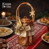 Декор виконаний у стриманому, традиційному стилі: натуральні текстильні елементи, мереживо, джутові стрічки та символічні акценти підкреслюють святковий характер кошика, не перевантажуючи його. Такий дизайн гармонійно поєднується з церковним простором і відповідає духовному змісту свята.