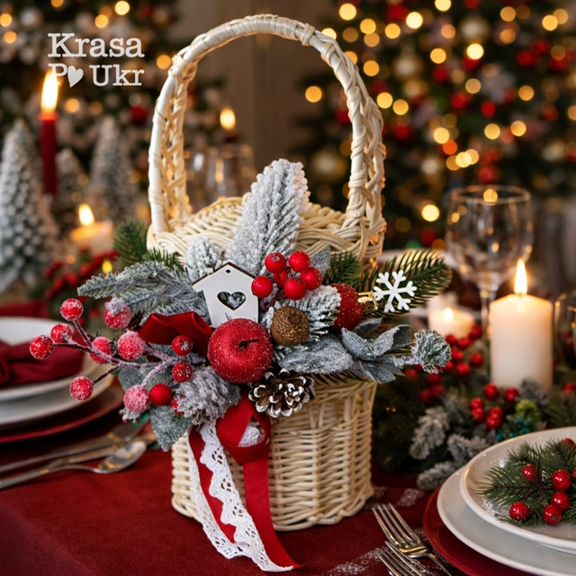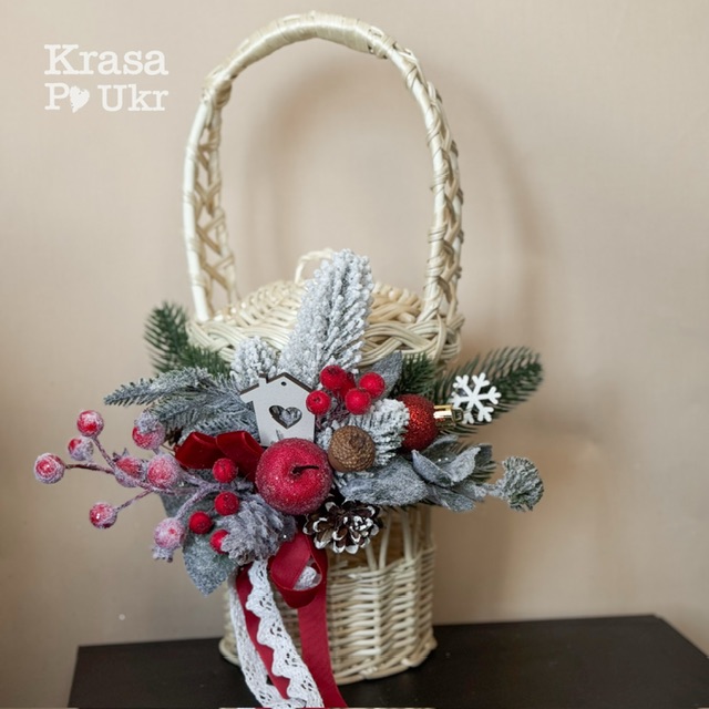 - декор кошика в украінській стилістиці – гілки калини, натуральні шишки, поєднання червоного і білого і т.д