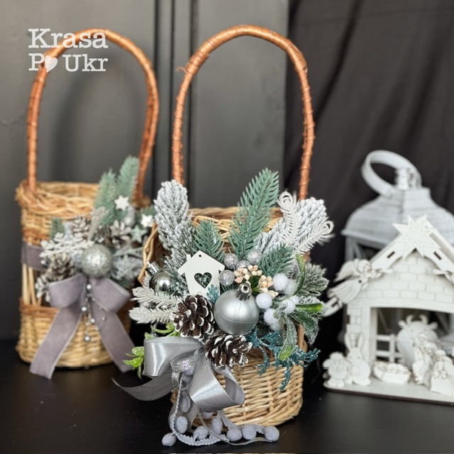 - Кошик на воду натуральний об’ємом на 1 літр задекоровано прикрасою в сіро-сизих відтінках. Цей колір – тренд не тільки в одязі, але й в зимових декорах.