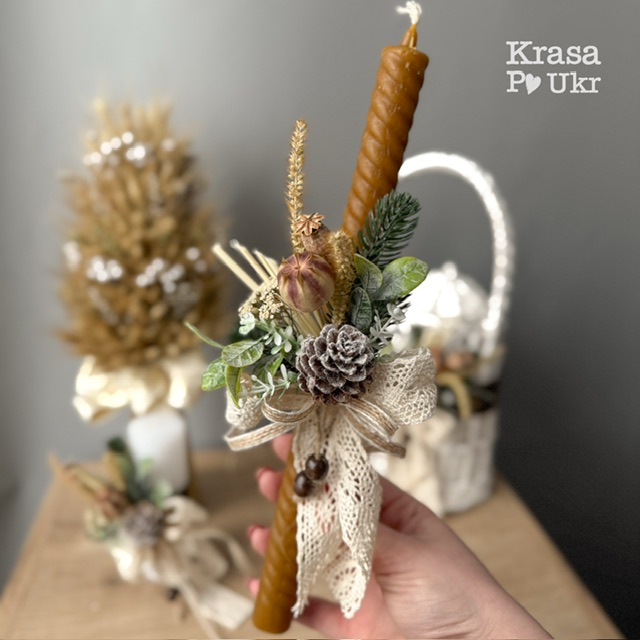 Комплект на Водохреща та Стрітення – свічка та кошик, дизайн “зелень та сухоцвіти” – свічка на вибір