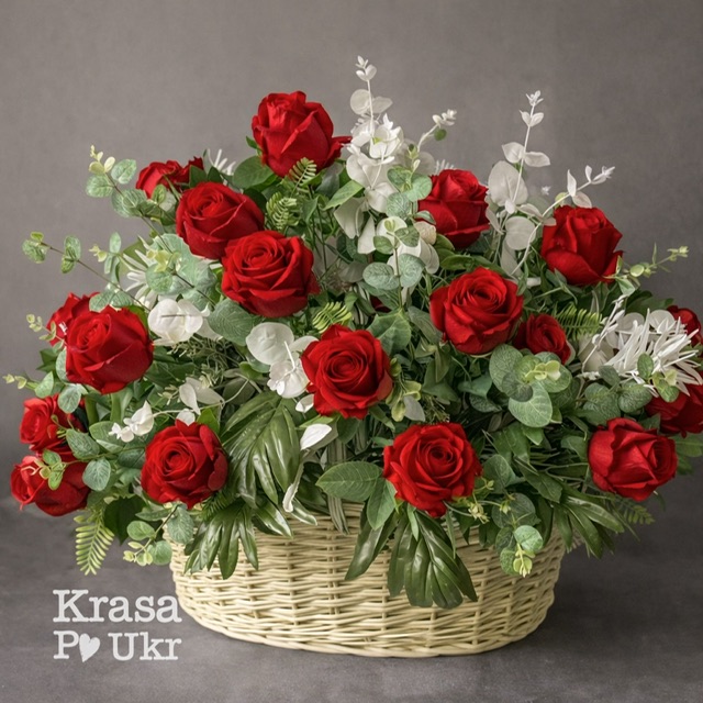 Велика штучна композиція у кошику з трояндами, доповнена евкаліптом та зеленню, створена у стриманій і витонченій кольорогаммі. Композиція виготовлена вручну з якісних штучних квітів, що довго зберігають охайний вигляд.