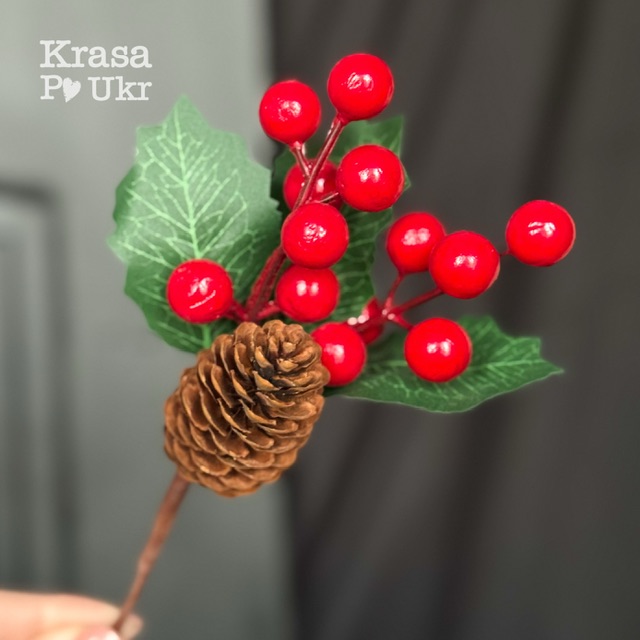 Декоративна гілка з червоними ягодами та шишкою — класичний елемент новорічного й різдвяного декору, який додає композиціям натуральності та святкового настрою. Яскраві червоні ягоди гармонійно поєднуються з зеленою листяною частиною та декоративною шишкою, створюючи теплий зимовий акцент. Гілка ідеально підходить для оформлення вінків, кошиків, святкових композицій, свічників, букетів і handmade-виробів. Легко комбінується з хвоєю, засніженою зеленню, текстилем та іншими різдвяними елементами. Універсальний вибір як для домашнього декору, так і для професійної флористики.