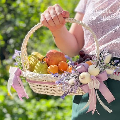 - кошик задекорований гілками лаванди, цукрованими яблуками, натуральним лагурусом
