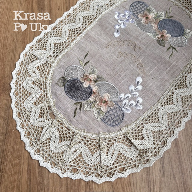 Монохромна машинна вишивка з писанками виконана у сірих відтінках, завдяки чому серветка виглядає дуже делікатно та сучасно. Такий дизайн підійде для тих, хто шукає неяскравий, елегантний великодній декор, який залишатиметься актуальним з року в рік.