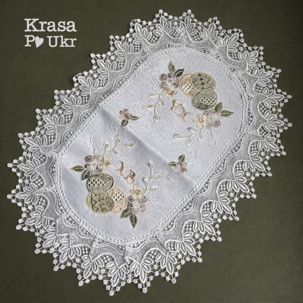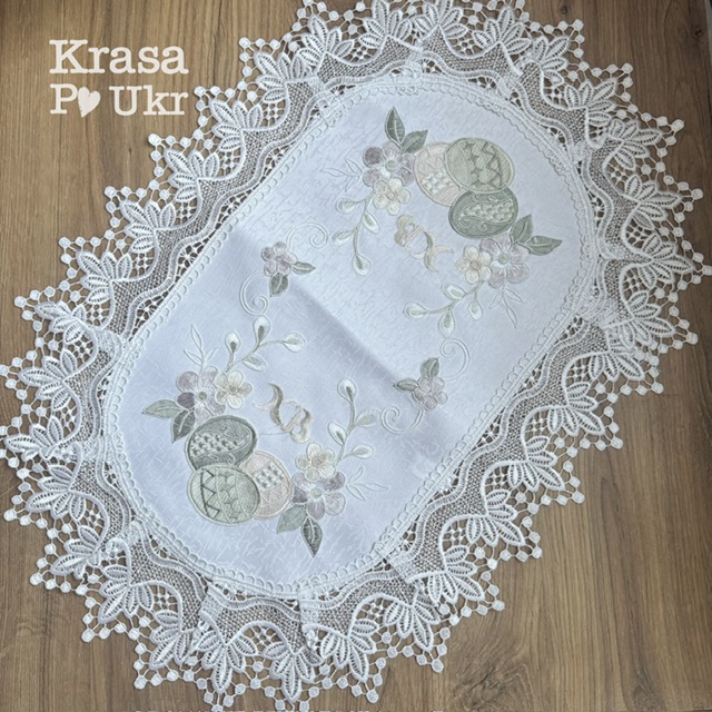 Атласна основа красиво відбиває світло, завдяки чому рушник виглядає святково навіть без яскравих кольорів. Ажурне мереживо делікатно обрамляє виріб, підкреслюючи овальну форму та додаючи відчуття завершеності.